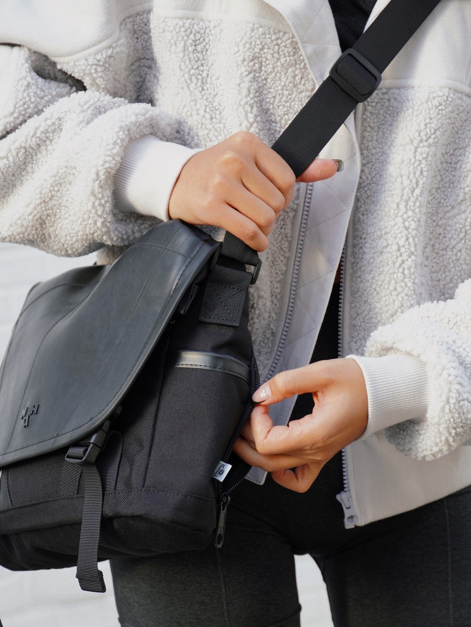 La abertura con cremallera trasera conduce a la bolsa principal para agarrarla fácilmente.